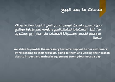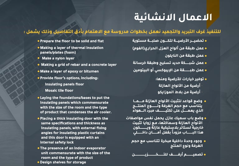 The Services Department at Asas Trading and Contracting Company is one of our most vital divisions, dedicated to providing comprehensive and efficient solutions in the fields of refrigeration, freezing, and food storage, as well as cold and dry transportation. With our qualified team and the modern technologies we utilize, we ensure high-quality services that meet the needs and expectations of our clients, contributing to their success and the continuity of their business operations with efficiency and effectiveness.